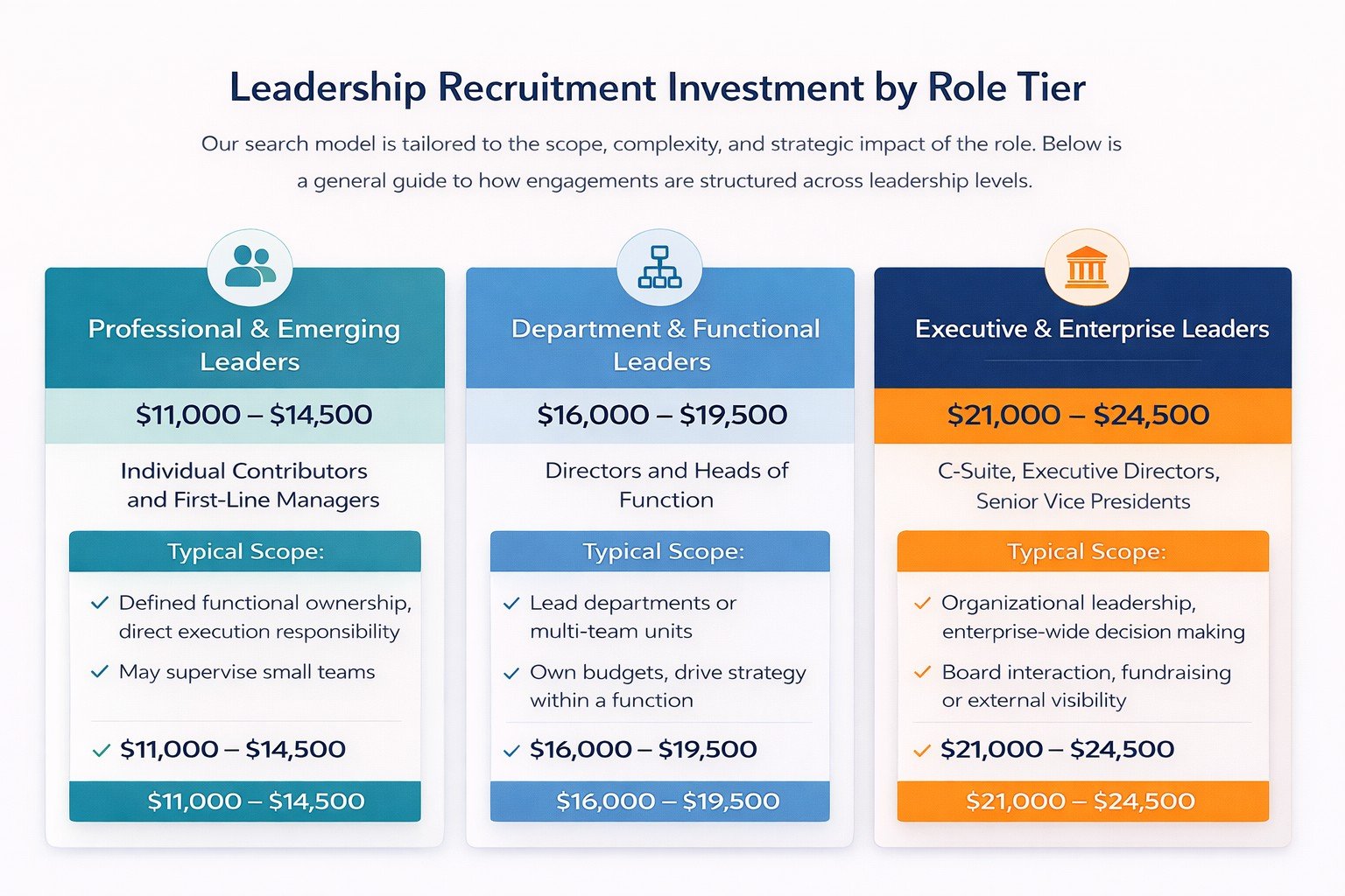 Scope Adjustments: Note that investment may adjust based on geographic complexity, accelerated timelines, highly specialized technical mandates, confidential or sensitive searches, or other factors we discuss with you. We scope every engagement transparently before contracting.